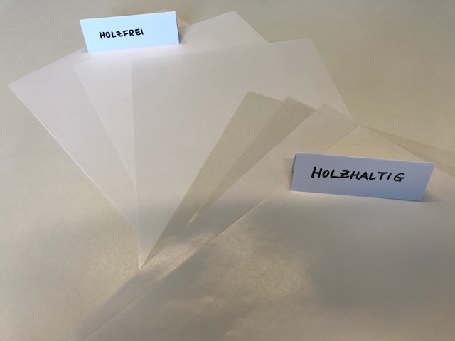 Wieso gibt es dann aber holzfreies Papier? Auch dieses Papier wird aus Holz hergestellt. Der Begriff holzfrei kommt daher, dass ein bestimmter Stoff (Lignin), der im Holz vorkommt, herausgefiltert wurde. Eigentlich müsste das Papier also Holzstoff-frei heißen. Durch das herauslösen von Lignin vergilbt das Papier später nicht so schnell und ist somit alterungsbeständiger. Als holzfreies Papier betitelt man es, wenn es nicht mehr als 5 Prozent Holzstoff enthält. Die Bezeichnung ist also ein bisschen irreführend, weil der Zellstoff ja auch aus Holz erzeugt wird.