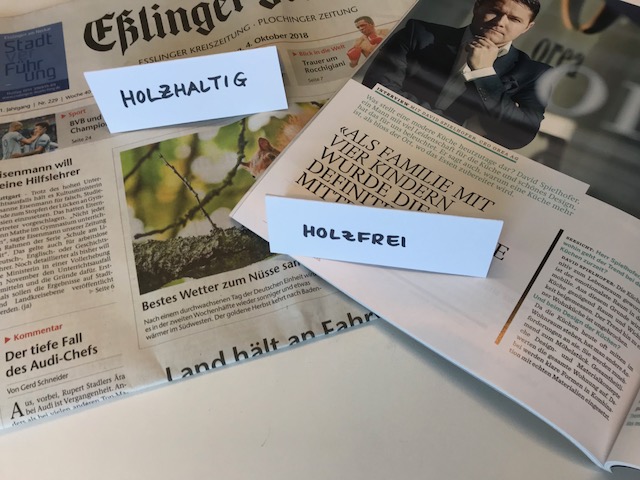 Papier, das Lignin enthält ist also holzhaltiges Papier. Es vergilbt schnell und wird oft deshalb für Druckobjekte verwendet, die nur temporär genutzt werden. Das sind zum Beispiel Zeitungen oder Werbedrucksachen. Somit beinflusst auch die gewünschte Nutzungsdauer des Druckproduktes die Papierwahl. Weitere Informationen zu Papierqualitäten gibt es hier.